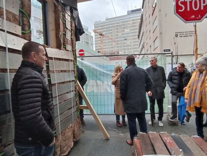 Anschließend wurde ein Pilotprojekt der seriellen Sanierung in der Arenberggasse besichtigt. Bei diesem Gebäude wurden vorgefertigte Module mit integrierter Bauteilaktivierung zur Heizung und Kühlung an die Fassade angebracht. Aufgrund des hohen Vorfertigungsgrades nahmen die Montagearbeiten nur wenige Tage in Anspruch. Die serielle Sanierung gilt aufgrund der kurzen Umsetzungszeit, der Klimafreundlichkeit und Energiekosteneinsparung als zukunftsweisende Sanierungsmethode und genießt daher hohe Aufmerksamkeit. Fast täglich wurde das Projekt im 10-tägigen Montagezeitraum besichtigt, einmal sogar von Vizekanzler und Wohnminister Andreas Babler, Innovationsminister Peter Hanke und Wiens Vizebürgermeisterin und Wohnbaustadträtin Kathrin Gaál.