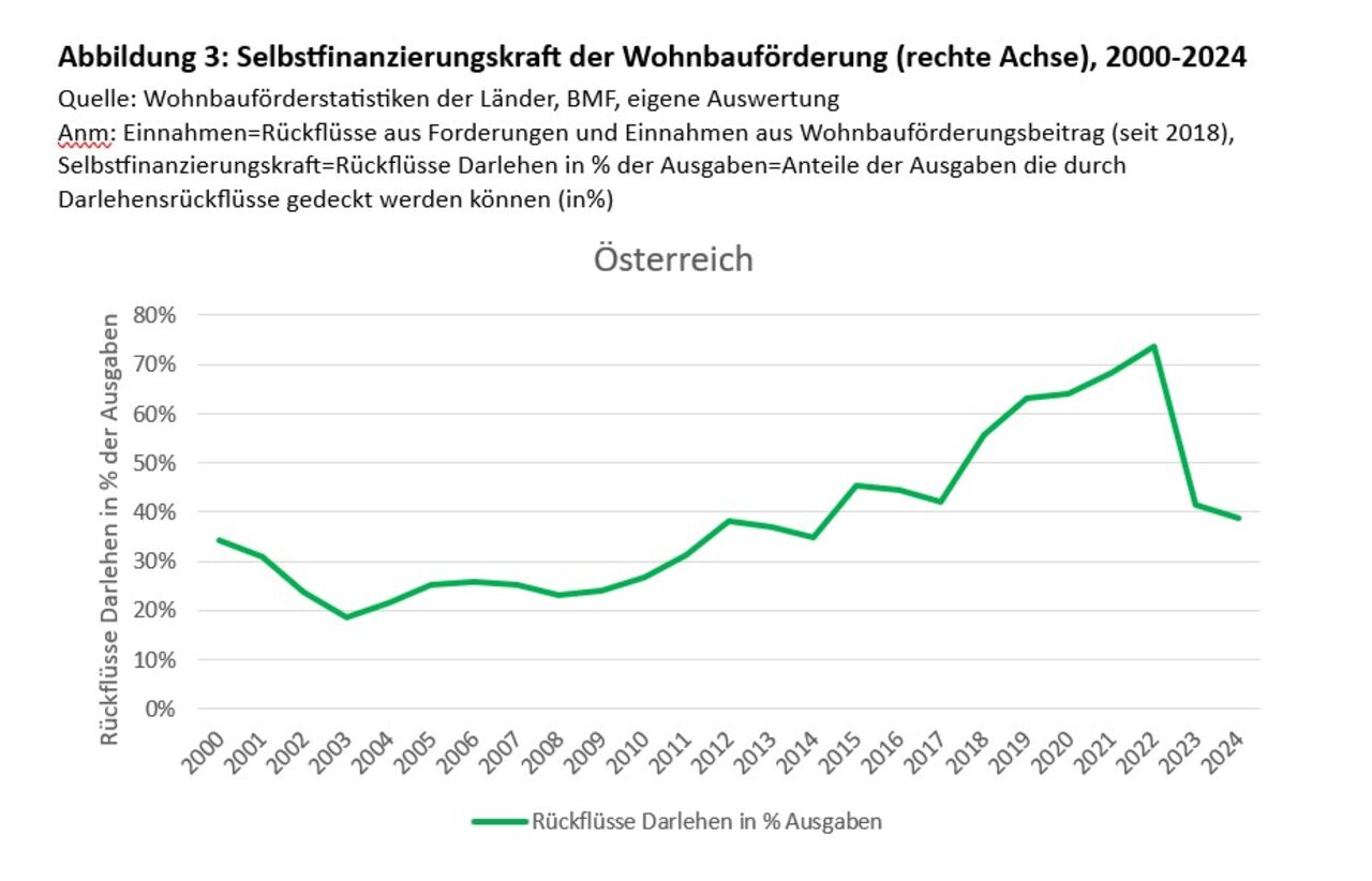 Dieses Darlehenssystem schafft einen revolvierenden Finanzierungskreislauf: Vergebene Mittel fließen über Jahre hinweg zurück und können erneut eingesetzt werden. Ende 2024 beliefen sich die aushaftenden Wohnbauförderdarlehen österreichweit auf rund 18,6 Milliarden Euro. Jährlich fließen etwa 5 % dieses Bestands in Form von Rückzahlungen in die Landesbudgets zurück. Insgesamt zeigt sich im Zeitraum 2022–2024 das österreichweit rund 50 % der Wohnbauförderungsausgaben allein durch Darlehensrückflüsse gedeckt werden konnten.
