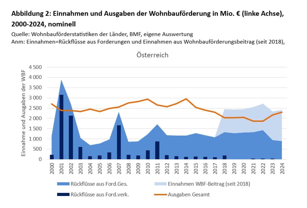 Im Zeitraum 2018–2024 betrugen die durchschnittlichen jährlichen Einnahmen rund 1,27 Milliarden Euro aus WBF-Beiträgen und rund 1,17 Milliarden Euro aus Darlehensrückflüssen. Hinzu kamen in einzelnen Jahren Einnahmen aus Forderungsverkäufen. Insgesamt lagen die jährlichen Gesamteinnahmen damit bei etwa 2,48 Milliarden Euro, während die durchschnittlichen Ausgaben rund 2,05 Milliarden Euro betrugen. Österreichweit wurden also in diesen Jahren im Schnitt rund 430 Millionen Euro mehr eingenommen als für Wohnbau und Sanierung ausgegeben wurde. Das System wies damit insgesamt eine solide Finanzierungsbasis auf, wenngleich die Einnahmen nicht mehr zweckgebunden sind.