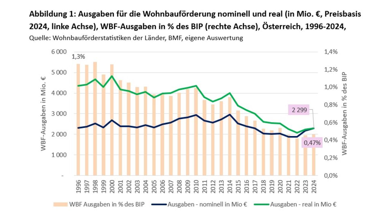 Obwohl zuletzt wieder mehr Mittel eingesetzt wurden, zeigt der langfristige Vergleich ein anderes Bild: Inflationsbereinigt sind die Wohnbauförderungsausgaben seit Mitte der 1990er-Jahre massiv zurückgegangen. Nominal lagen die Ausgaben 2024 etwa auf dem Niveau von 1996. Real – also zu Preisen des Jahres 2024 – bedeutet das jedoch einen Rückgang um rund 47 %. Auch im Verhältnis zum Bruttoinlandsprodukt ist die Wohnbauförderung deutlich geschrumpft: Von 1,3 % des BIP im Jahr 1996 auf heute knapp 0,5 %. Das heißt: Trotz stabiler Einnahmenbasis wird heute real deutlich weniger für Wohnbauförderung aufgewendet als vor rund 30 Jahren.