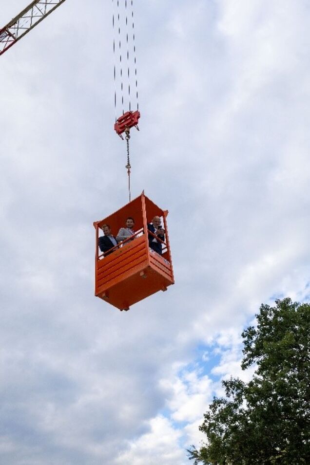 Hoch hinaus ging es bei der Gleichenfeier der Siedlungsunion in der Donaustadt: Die Anwesenden hatten die Chance, die Baustelle vom Kran aus zu besichtigen und sich aus der Vogelperspektive einen Überblick zu verschaffen.