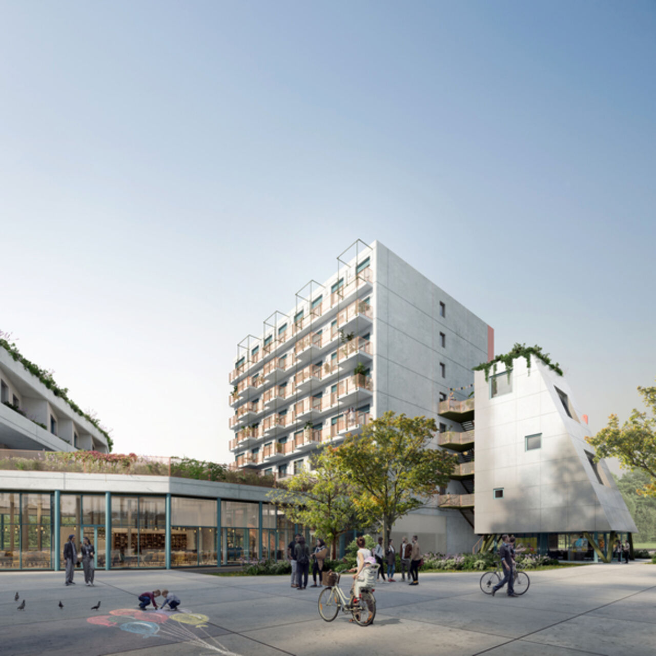 Die Schönere Zukunft präsentierte ihr geplantes Wohnbauprojekt „Quartier Seecarré“. Drei Geschwistergebäude in flexibler und ressourcenschonender Bauweise sollen hierbei einen Fokus auf soziale und ökologische Nachhaltigkeit legen.
