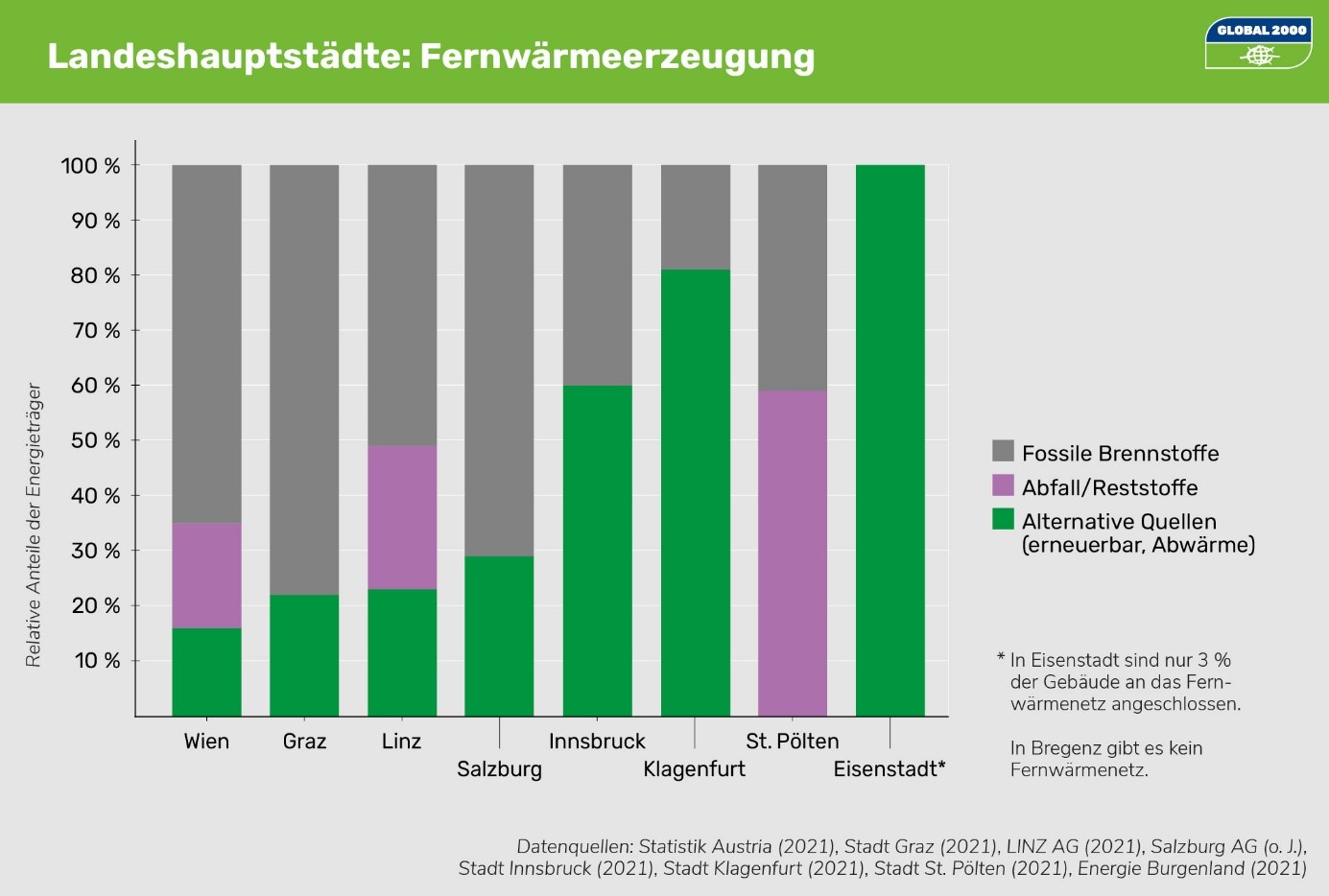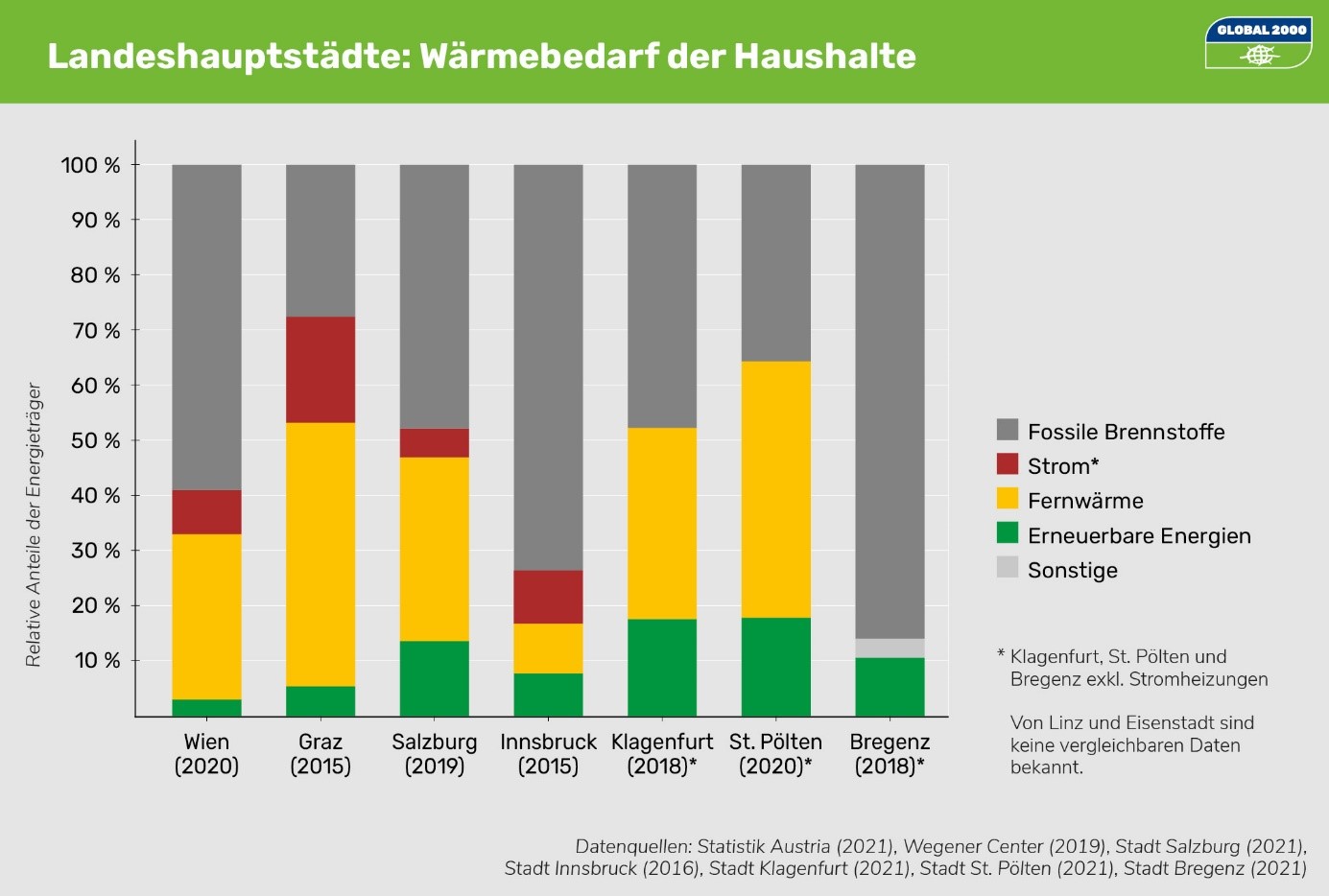 Eine wichtige Rolle beim Umstieg auf klimaneutrale Heizungssysteme spiele Städte. Fast zwei Drittel der österreichischen Bevölkerung wohnen in Städten oder urbanen Räumen. GLOBAL 2000 hat sich in einer neuen Studie, die u.a. auf Zahlen der Statistik Austria und Energieberichte der Landeshauptstädte, angesehen, wie in den Landeshauptstädten geheizt wird. Es zeigt sich, dass einzelne Landeshauptstädte (z.B. Wien und Klagenfurt) bereits ambitionierte Klimaziele verfolgen, aber viele Ziele noch nicht erreicht sind. Solche Strategien sind wichtig, da sie Zeitschienen und konkrete Projekte definieren und viele Klimaschutzprojekte dadurch ihren Ausgang nehmen. Die Details, wie sich die Situation in den Landeshauptstädten in punkto Heizen darstellt, lesen Sie in der GLOBAL 2000-Studie „So heizen die Landeshauptstädte“ (kostenloser Download) https://www.global2000.at/publikationen/klimareport-so-heizen-die-landeshauptstaedte
