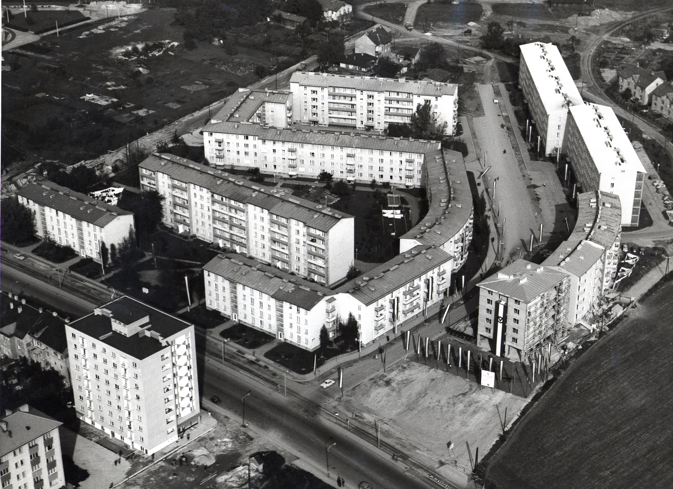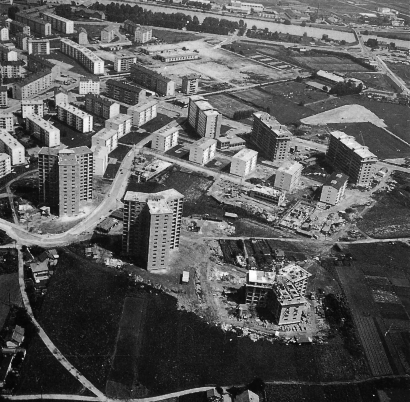 Innsbruck, Bau der „Sternhochhäuser“ der Neuen Heimat Tirol, 1968, im Rahmen der städtischen Wohnbauprogramme. Foto: Richard Frischauf. Aus: Klaus Lugger, Wohnbau sozial. Innsbruck von 1900 bis heute. Innsbruck: Haymon, 1993