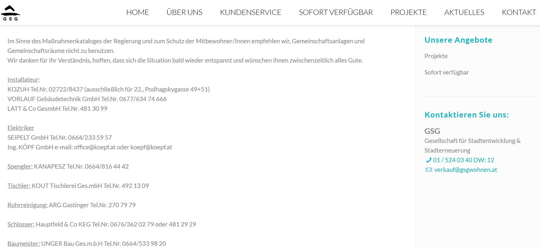 Auf der Homepage der GSG finden die Bewohnerinnen und Bewohner eine Liste der wichtigsten Professionisten, die im Notfall direkt kontaktiert werden können. Durch diesen „direkten Draht“ haben Bewohnerinnen und Bewohner einen direkten Ansprechpartner und entlasten die Telefonleitungen des Bauträgers. Ein sinnvoller Schritt, um eine rasche Behebung von Problemen zu gewährleisten.