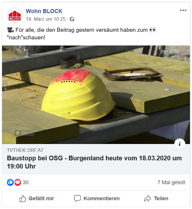 Die OSG informiert auf der Social Media-Plattform Facebook über die aktuellen Baustopps. Die Einhaltung der geforderten Mindestabstände zwischen den Arbeitern kann nicht gewährleistet werden und das Risiko, die Infektion im Arbeitsalltag auf der Baustelle zu verbreiten, sei zu hoch. Die zum Schutz aller gesetzten Maßnahmen der OSG sowie der anderen gemeinnützigen Bauträger sind ein starkes Signal für Mitarbeiterinnen und Mitarbeiter.