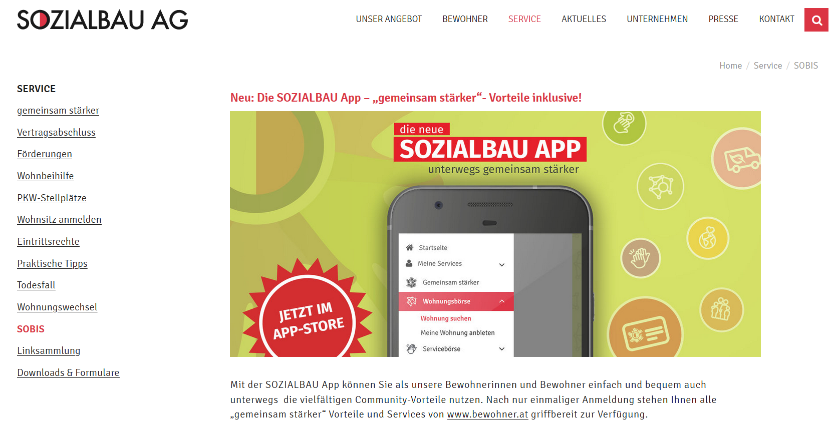 Mit dem Credo „gemeinsam stärker“ liefert die Sozialbau AG eine digitale Lösung für Anliegen aller Art für Bewohnerinnen und Bewohner des gemeinnützigen Wohnbaus. Unabhängig von Zeit und Ort können diese mit der Sozialbau APP unter anderem auf die Wohnungstauschbörse zugreifen, Schadensmeldungen erstellen sowie Nachbarschaftshilfe in Anspruch nehmen oder anbieten. Auf Wunsch informiert die App auch laufend über wichtige Ereignisse in der Wohnhausanlage und dem Grätzel. Das Miteinander ist auch in der Zeit der Isolation ungemein wichtig für die österreichische Bevölkerung. Mit dem Angebot der Sozialbau wird eine zeitgemäße digitale Lösung geboten, Normalität in der Gemeinschaft und Wohnungsbranche zu erleben.