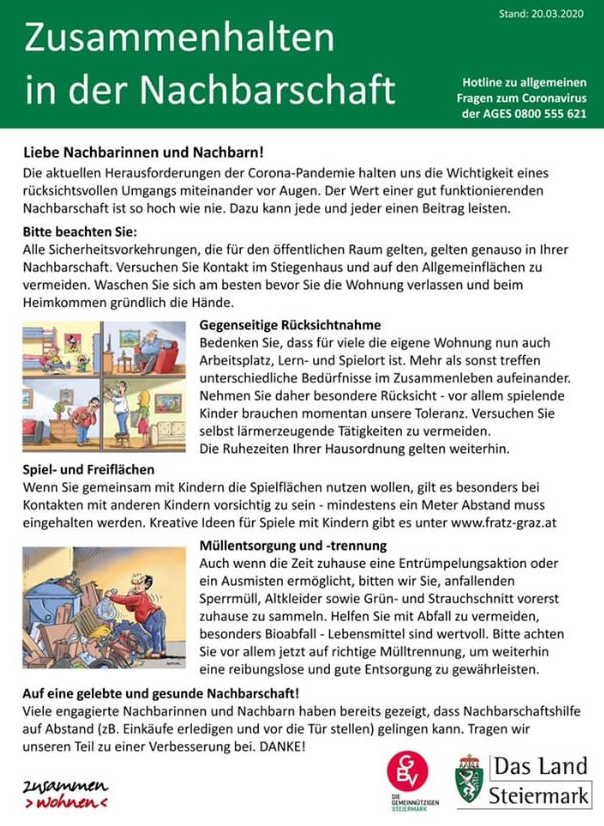 Wie verhalten in der derzeitigen Situation? Die steirischen Gemeinnützigen geben in einem einfach und freundlich aufgebauten Infoblatt die wichtigsten Verhaltensregeln zum Besten – vom Kontakt im Stiegenhaus, gegenseitiger Rücksichtnahme in der Nachbarschaft, Nutzung von Spiel- und Freiflächen bis hin zur Müllentsorgung. Ein paar nette Comics dazwischen inklusive: