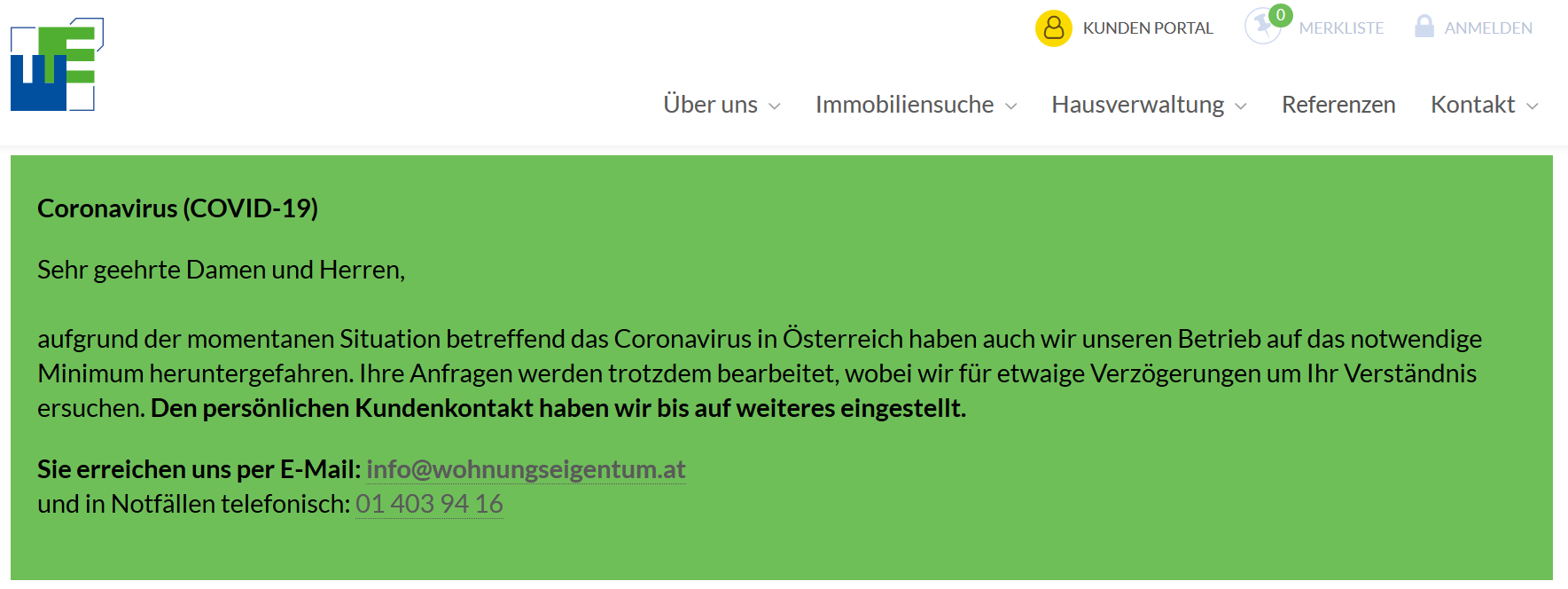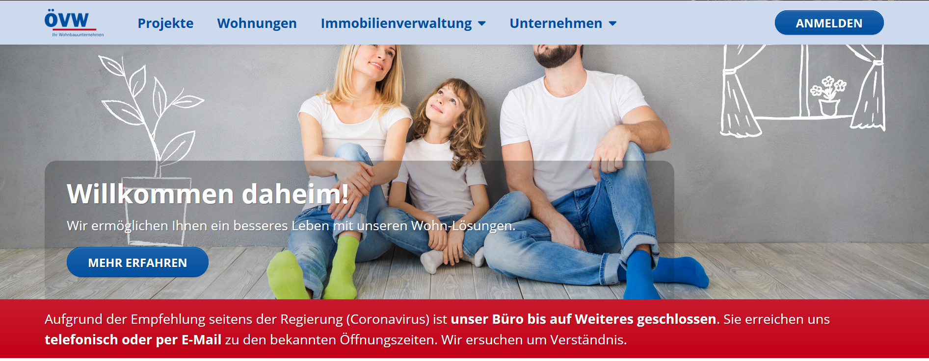 Mitteilungen wie „Aufgrund der momentanen Situation (…) haben auch wir unseren Betrieb auf das notwendige Minimum heruntergefahren“ oder „Im Interesse unserer Kunden, Geschäftspartner und Mitarbeiter haben wir uns entschlossen, den persönlichen Kontakt im Büro bis auf weiteres einzustellen“ finden sich derzeit auf vielen Websites der gemeinnützigen Bauträger. Durch den Wegfall des körperlichen Kundenkontakts können Mitarbeiterinnen und Mitarbeitern wie auch Kundinnen und Kunden geschützt werden – denn Gesundheit geht vor. Hilfestellungen und Notdienste bieten die gemeinnützigen Bauträger dennoch via Mail und Telefon, wie die Beispiele der ÖVW, Wohnungseigentum und TIGEWOSI zeigen. Ein wichtiger Service, der uns allerdings auch vor Augen hält, das Zwischenmenschliches nur bedingt durch moderne Technologien ersetzt werden kann: