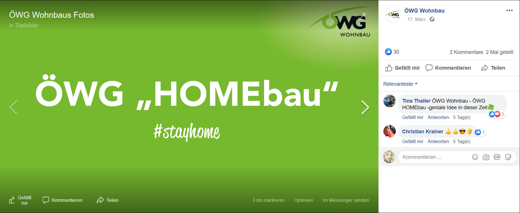 Dass die häusliche Isolation auch als Anstoß dienen kann sich am Wohnungsmarkt neu umzuschauen, versucht die ÖWG mit einem Augenzwinkern zu vermitteln: „Der eine oder andere von euch hat diese Woche vielleicht festgestellt, dass die Wohnung doch zu klein ist?“ lautet die Einleitung eines originellen Facebook-Post, der zu den aktuellen Wohnbau-Angeboten des Bauträgers weiterleitet, der sich vorübergehend von „Wohnbau“ auf „HOMEbau“ umbenannt hat. Mit dem Hashtag #stayhome wird zudem auf die Dringlichkeit, sich in der aktuellen Lage Zuhause aufzuhalten, hingewiesen.