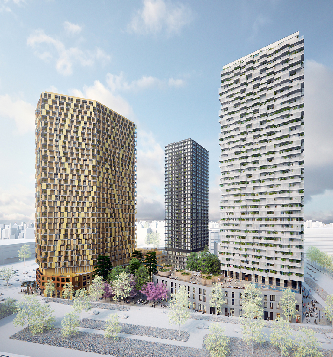 Es ist ein Projekt, wie man es selten sieht. 4 Bauträger, 3 Hochhäuser, mehr als 1.200 Wohnungen, Studierenden-WGs, Wohngemeinschaften, „Serviced Apartements“ für Kurzzeitwohnen sowie Geschäftsflächen und viele Extras. Das sind nur ein paar Fakten, die das Projekt „The Marks“ im Stadtentwicklungsgebiet Neu Marx im 3. Wiener Gemeindebezirk charakterisieren. Bis 2023 errichten hier die drei gemeinnützigen Bauträger Österreichische Siedlungswerk (ÖSW), Neues Leben und WBV-GPA gemeinsam mit der BUWOG drei neue „Landmarks“. Ein besonderes Augenmerk liegt bei diesem Projekt auf der sozialen Durchmischung und Diversität im Wohnungsmix. Extras wie Gemeinschaftsräume, Garagen, Grünflächen oder Spielplätze sind dementsprechend bauplatzübergreifend konzipiert. Die Sockelzone verbindet die drei Häuser und bietet neben Geschäftsflächen auch rund 2.000 Fahrradabstellplätze. Das ist übrigens die größte Fahrrad-Garage Wiens. Zusätzlich ist ein Mobilitätskonzept inklusive Car-Sharing-Modell vorgesehen. Auch die Lage des Projekts ist ansprechend: Der Prater ist schnell und bequem erreichbar, die Marx Halle, die geplante Groß-Eventhalle Neu Marx (Alternative zur Stadthalle) aber auch das Kino- und Eventcenter Gasometer sind zu Fuß erreichbar. Die Fertigstellung der drei Hochhäuser ist für Anfang 2023 geplant.