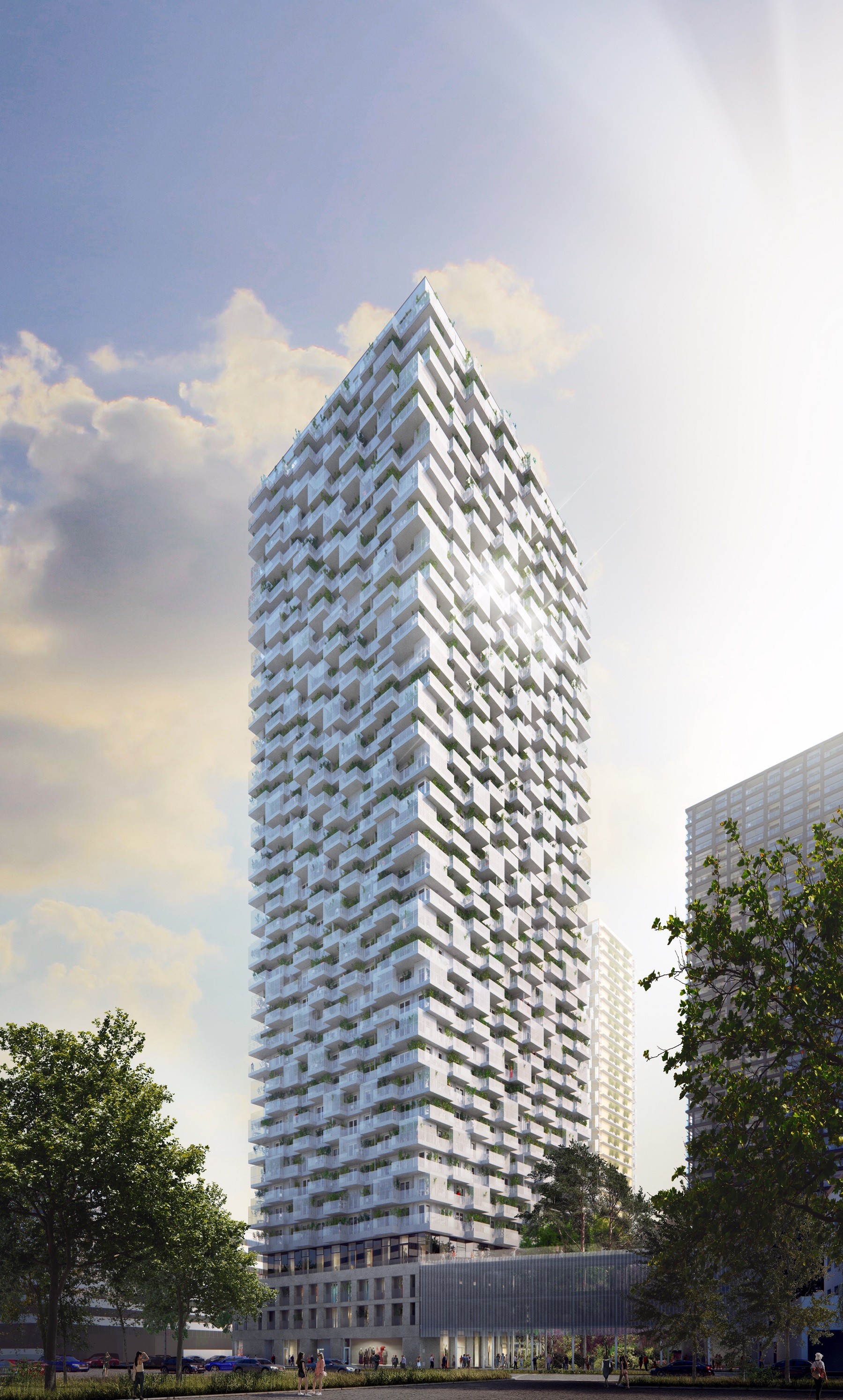 Der zweite Turm, der diesmal gleich von zwei GBVs (Neues Leben, WBV-GPA) errichtet wird, nennt sich „the one“ und ist das höchste der drei Wohnhochhäuser. Unterschiedliche Wohnungsgrößen (1-5 Zimmer) stehen zum Verkauf und zur Miete bereit. Der Turm wird 178 Mietwohnungen und 232 freifinanzierte Eigentumswohnungen beheimaten und wurde von studiovlay.streeruwitz Architekten geplant. Als einziger Wohnturm im Quartier verfügt „the one“ über ein Schwimmbecken im Außenbereich, das exklusiv den Bewohnerinnen und Bewohnern von „the one“ zur Verfügung steht. Ergänzt wird das Angebot durch eine hauseigene 400m lange Laufstrecke und ein privates Fitnessstudio. Mehr Infos finden Sie hier.