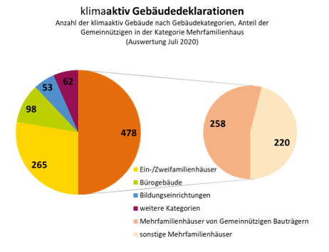 Grafik: Anzahl der klimaaktiv Gebäude insgesamt und Anteil der Gemeinnützigen im mehrgeschoßigen Wohnbau (Stand Juli 2020; Sonderauswertung aus der klimaaktiv Gebäude Datenbank)