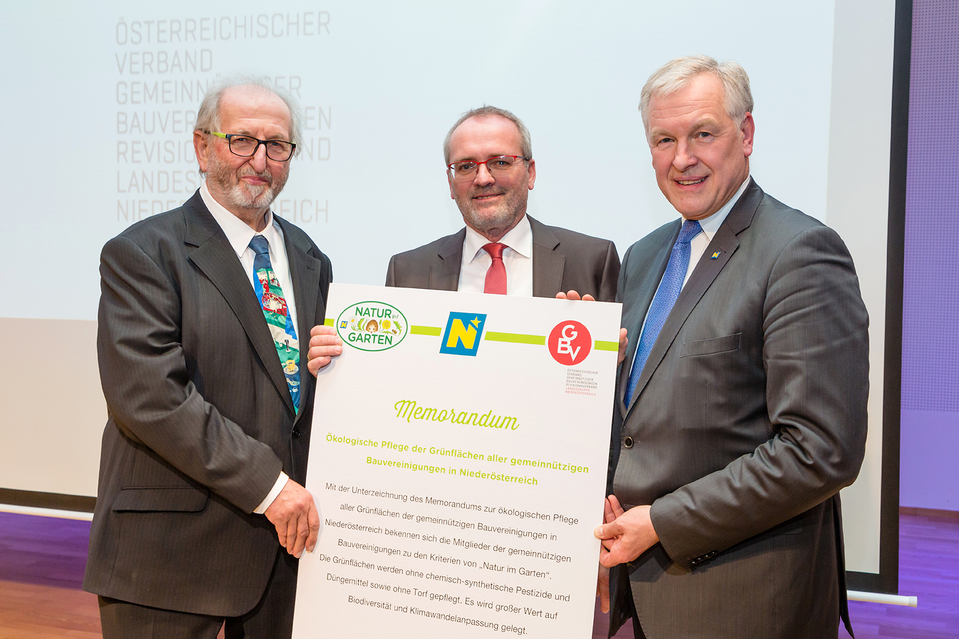 Engagement für die Natur und ökologisches Handeln werden auch bei den GBVs großgeschrieben. Denn Eines steht fest: Exzellenter Bau braucht einen ökologischen Schwerpunkt. Angesichts dessen war ein weiteres Highlight des diesjährigen Frühlingsempfangs des GBV NÖ die Unterzeichnung eines Memorandums für ökologische Grünraumbewirtschaftung. Mit ihrer Unterschrift erklären sich die gemeinnützigen Bauträger dazu, Grünflächen ohne chemisch-synthetische Pestizide und Düngemittel ohne Torf zu verwenden. Zusätzlich verpflichten sie sich aber auch die Biodiversität zu fördern. „Dach- und Fassadenbegrünung, Versicherungsflächen, Klimafitte Parkplätze, Förderung der Artenvielfalt – es gibt bereits viele Aktionen, die zur positiven Beeinflussung des Mikroklimas seitens der Bauträger umgesetzt werden. Nun gehen wir für ein gesundes Morgen einen Schritt weiter. Gemeinsam mit den gemeinnützigen Bauträgern haben wir uns als Land NÖ der ökologischen Pflege aller Grünflächen verschrieben“, meint Landesrat Eichtinger über die ökologische Grünraumbewirtschaftung. Um dieses Vorhaben zu unterstreichen, ging der GBV eine Kooperation mit Natur im Garten ein. In Zuge dieser Zusammenarbeit wird einerseits für jedes Neubauprojekt ein Baum gespendet und andererseits auch ein Nützlingshotel errichtet.