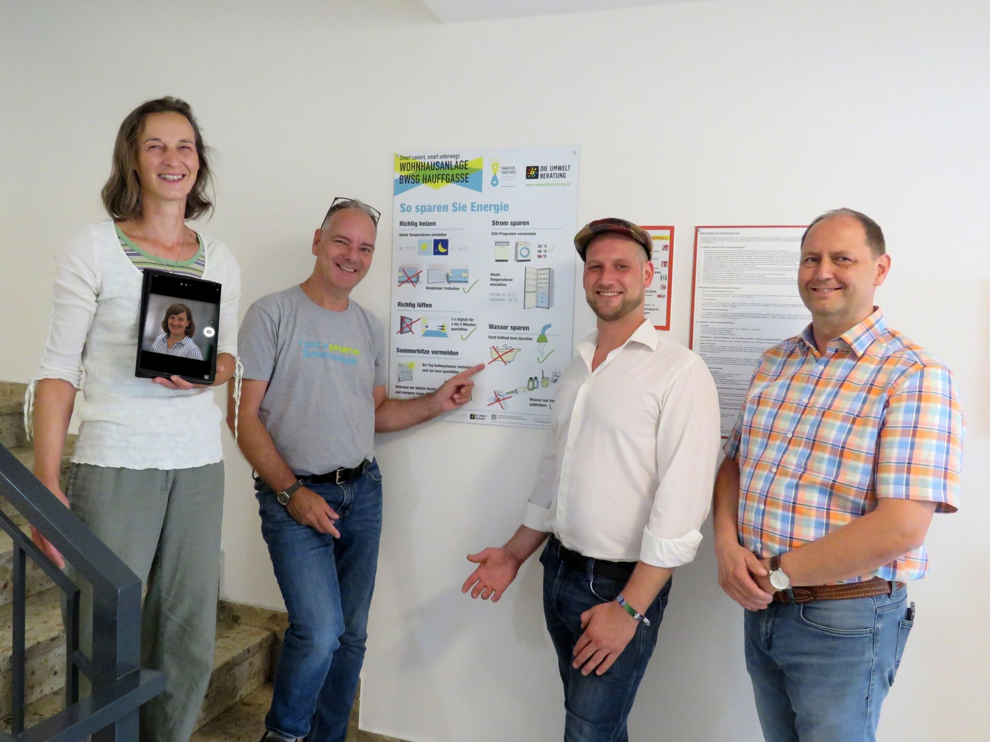 Energiespar-Infotafeln in der BWSG Wohnhausanlage, v.l.n.r. Sabine Vogel (DIE UMWELTBERATUNG), Bojan Schnabl (Stadt Wien, MA 50/WBF), Max Mutz (wohnbund:consult), Martin Sommer (BWSG) sowie Eva Lems per Videochat. © DIE UMWELTBERATUNG by Monika Kupka