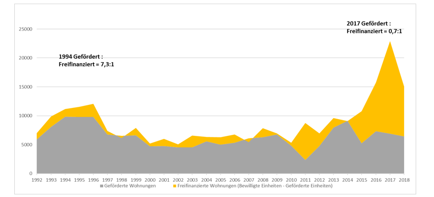 Abbildung 1: Geförderter Neubau (Förderungszusicherungen) und freifinanzierter Neubau (Bewilligungen) in Wien (1992-2018)