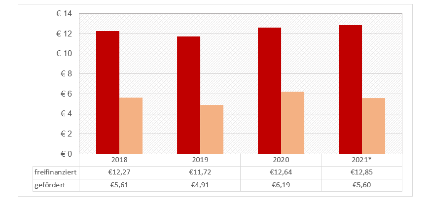 Abbildung 27: m2-Mieten geförderter und freifinanzierter Wohneinheiten nach Jahren (Mittelwert, 2018-2021*)