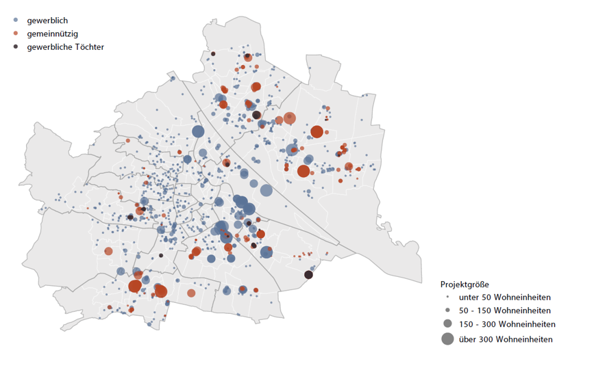Die räumliche Verteilung gemeinnütziger und gewerblicher Projekte unterscheidet sich deutlich (Abbildung 2). Neben vielen kleinen, gleichmäßig über den Stadtraum verteilten gewerblichen Projekten, sind große gewerbliche Projekte ebenfalls in den Stadterweiterungsgebieten sowie im 2. und 3. Bezirk zu finden. Neubauprojekte von gemeinnützigen Bauträgern sind im Schnitt größer und finden sich vorrangig in den äußeren Bezirken bzw. sind auf wenige Erweiterungsgebiete außerhalb des Gürtels konzentriert (z.B. Nordbahnviertel, Sonnwendviertel, Seestadt. Hohe Bodenpreise und geringe innerstädtische Flächenverfügbarkeit sind mutmaßlich zentrale Faktoren für dieses räumliche Muster.